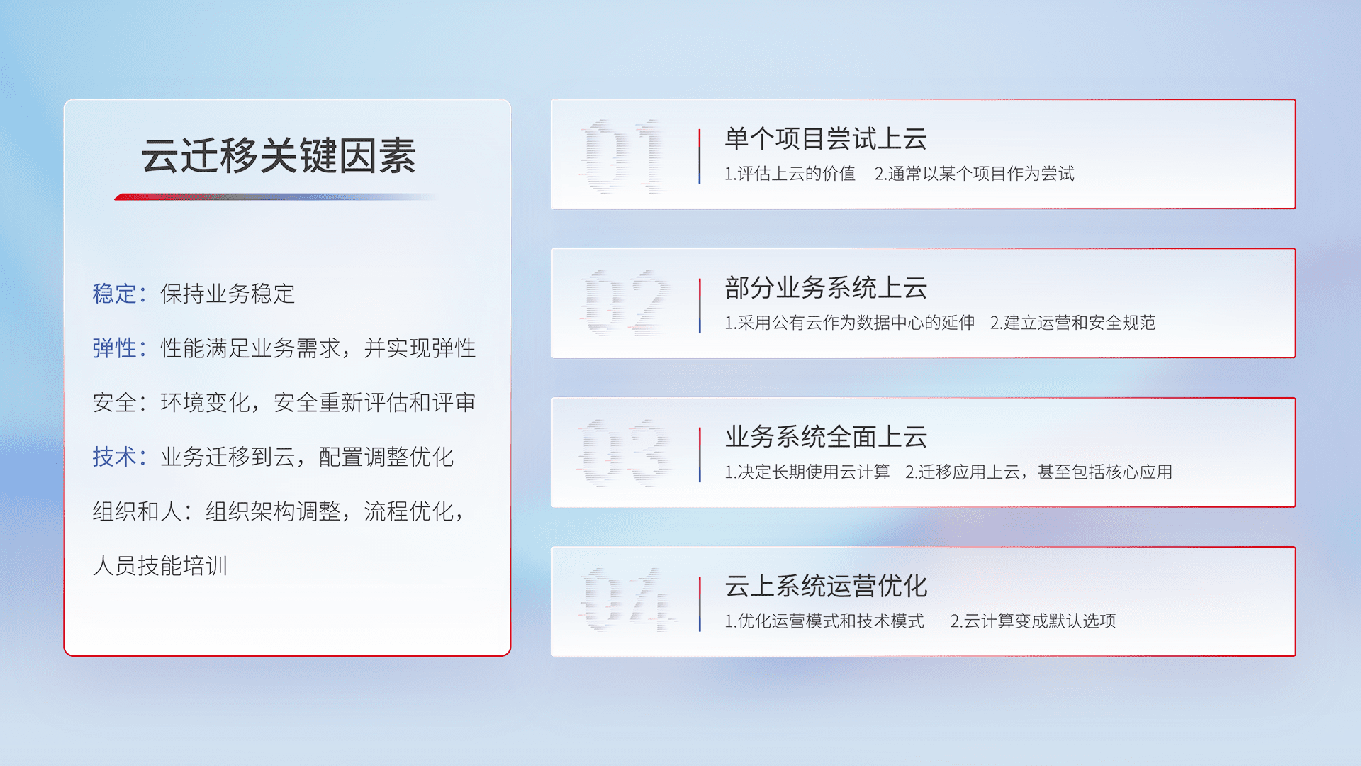 结合实际业务,,从规划设计、、云平台选型、、、云原生改造、、数据迁移、、集成交付,,,,迁移全过程为客户识别最佳上云路径,,,,做好风险识别管理,,,,设计网络架构、、身份权限、、、、安全审计合规、、、、操作审计、、、日志审计、、、监控告警策略、、多站点容灾设计等,,,对云上基础设施进行整体规划,,,提升IT治理水平,,以满足弹性、、、、高可用、、、高性能的需求。。。。
